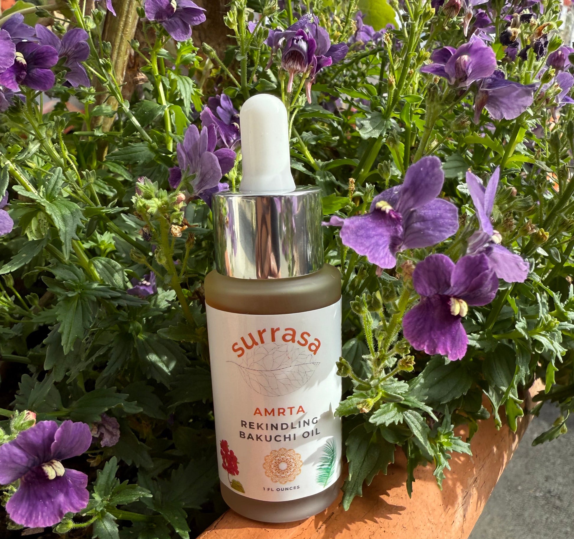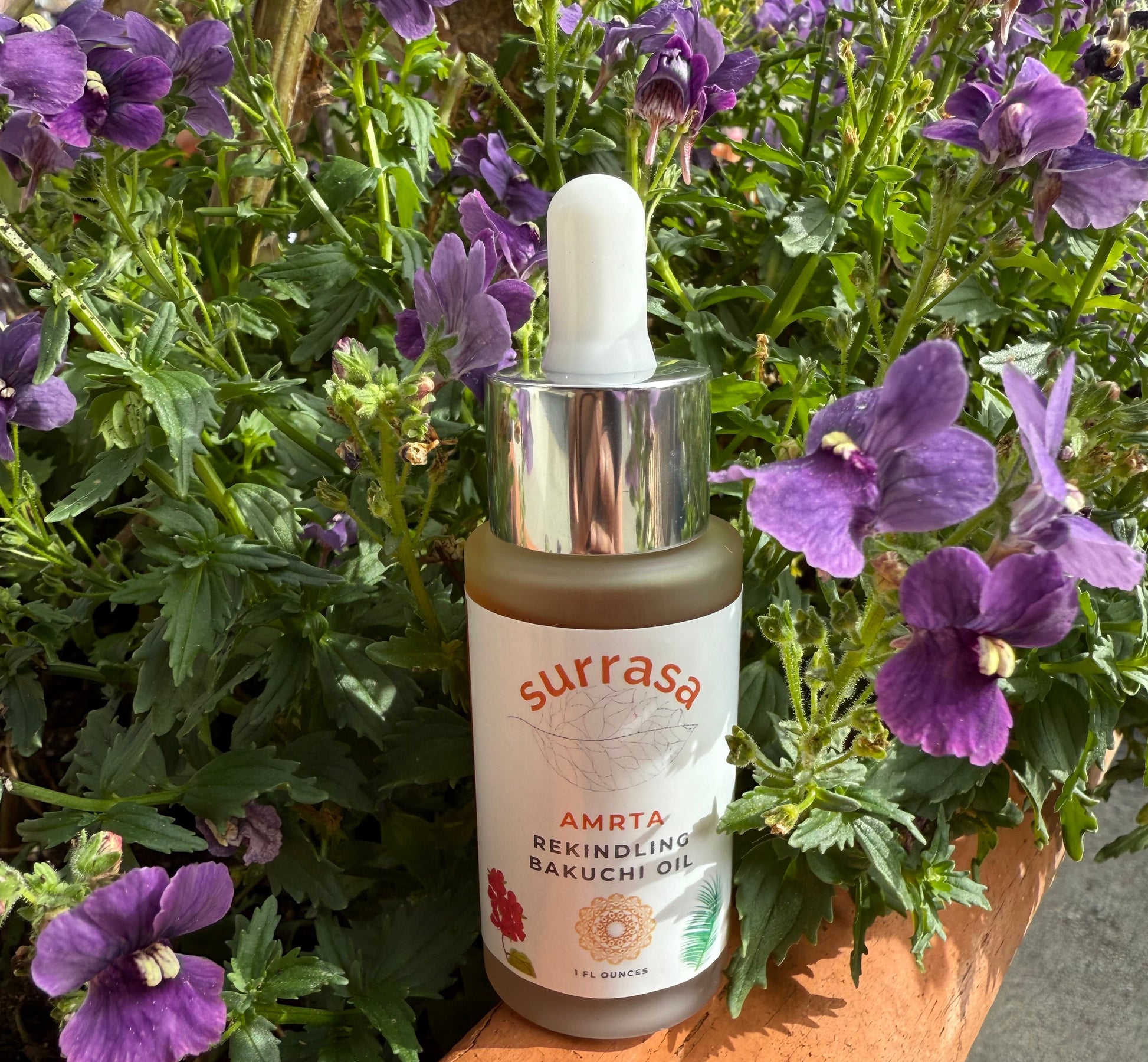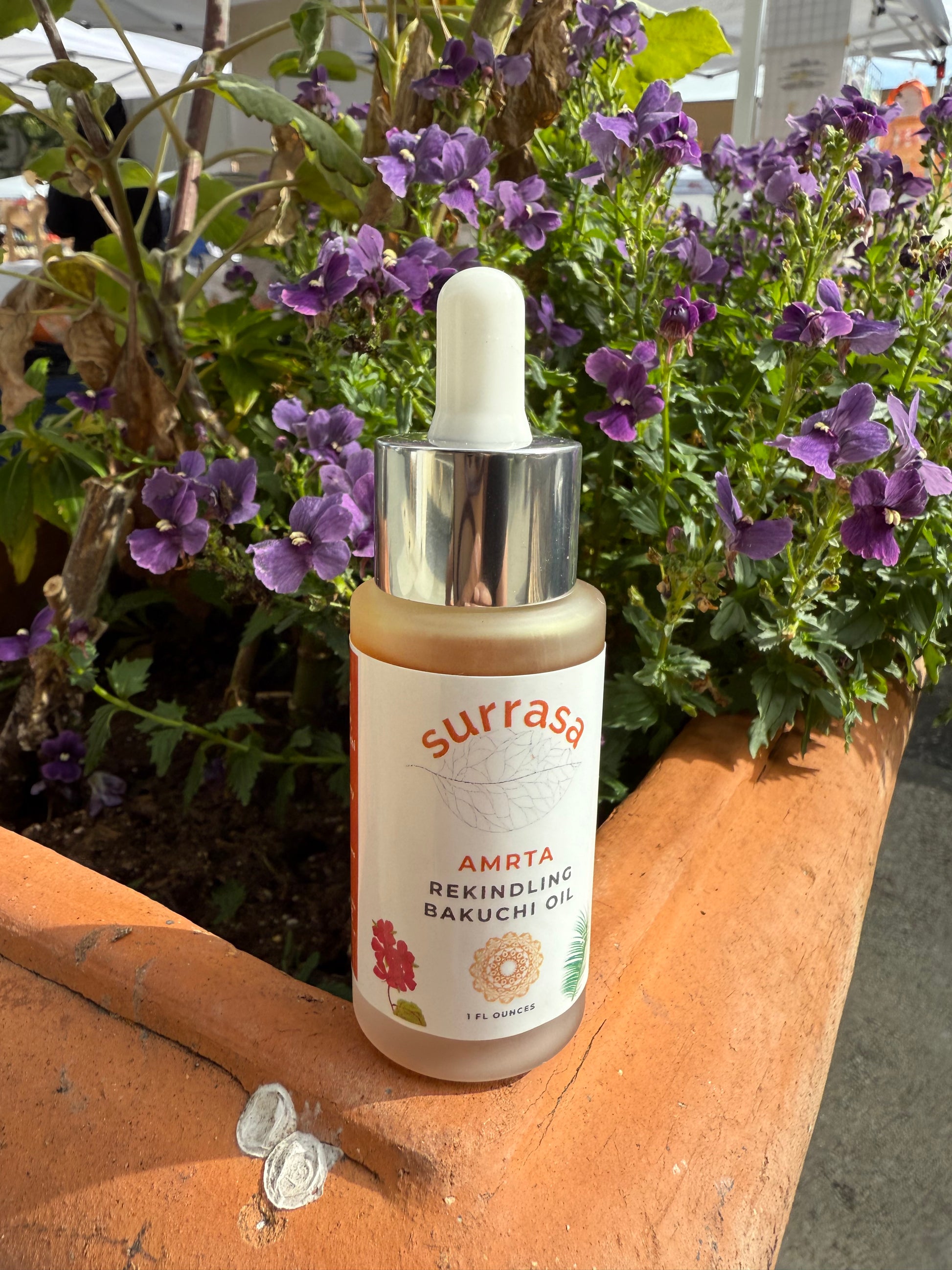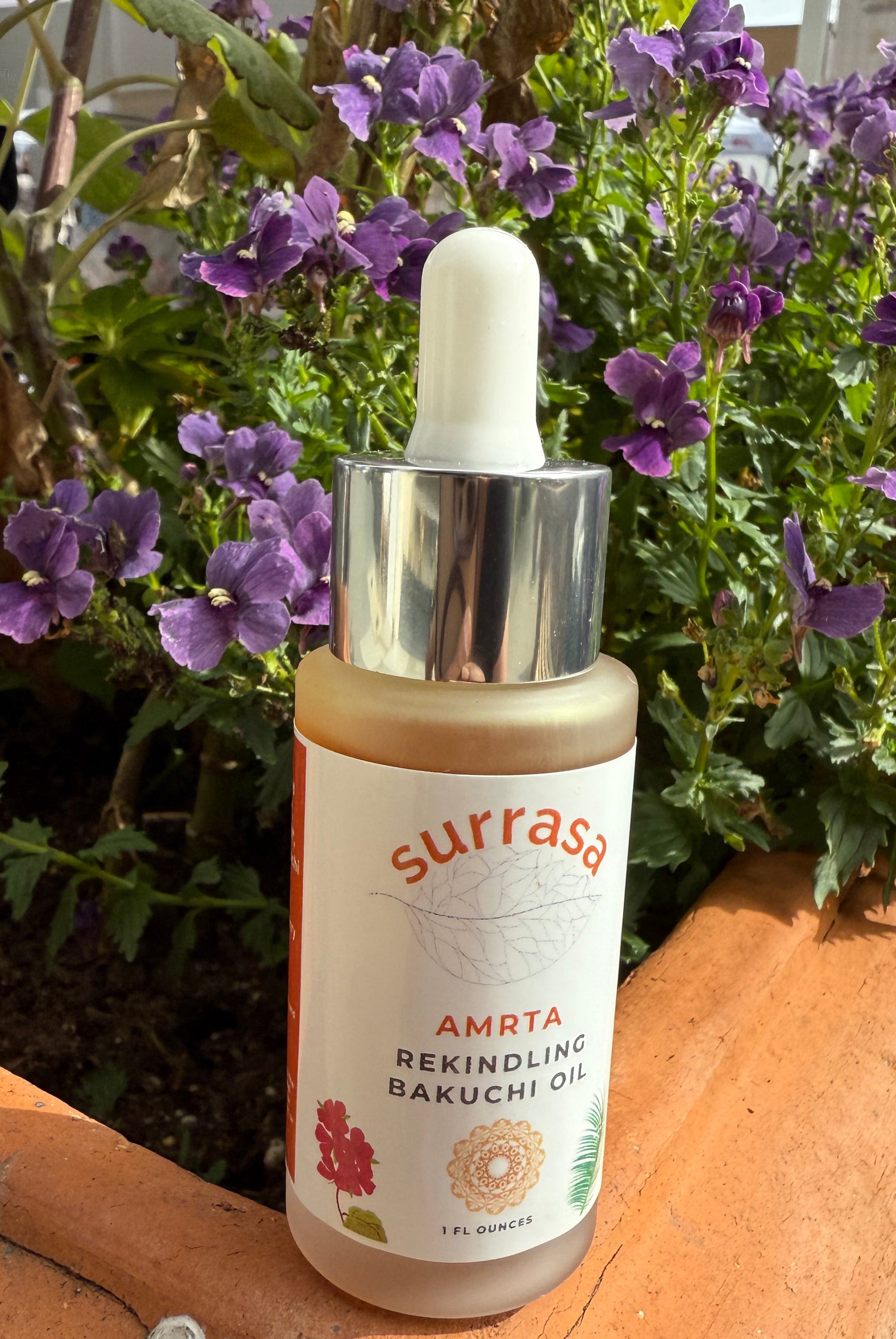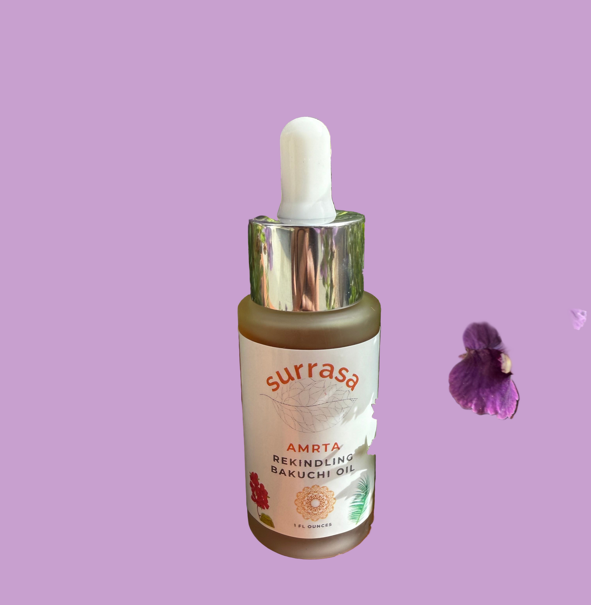 Discover the rejuvenating essence of Amrta Rekindling Bakuchi Oil, an exceptional blend curated exclusively by Surrasa Skincare.